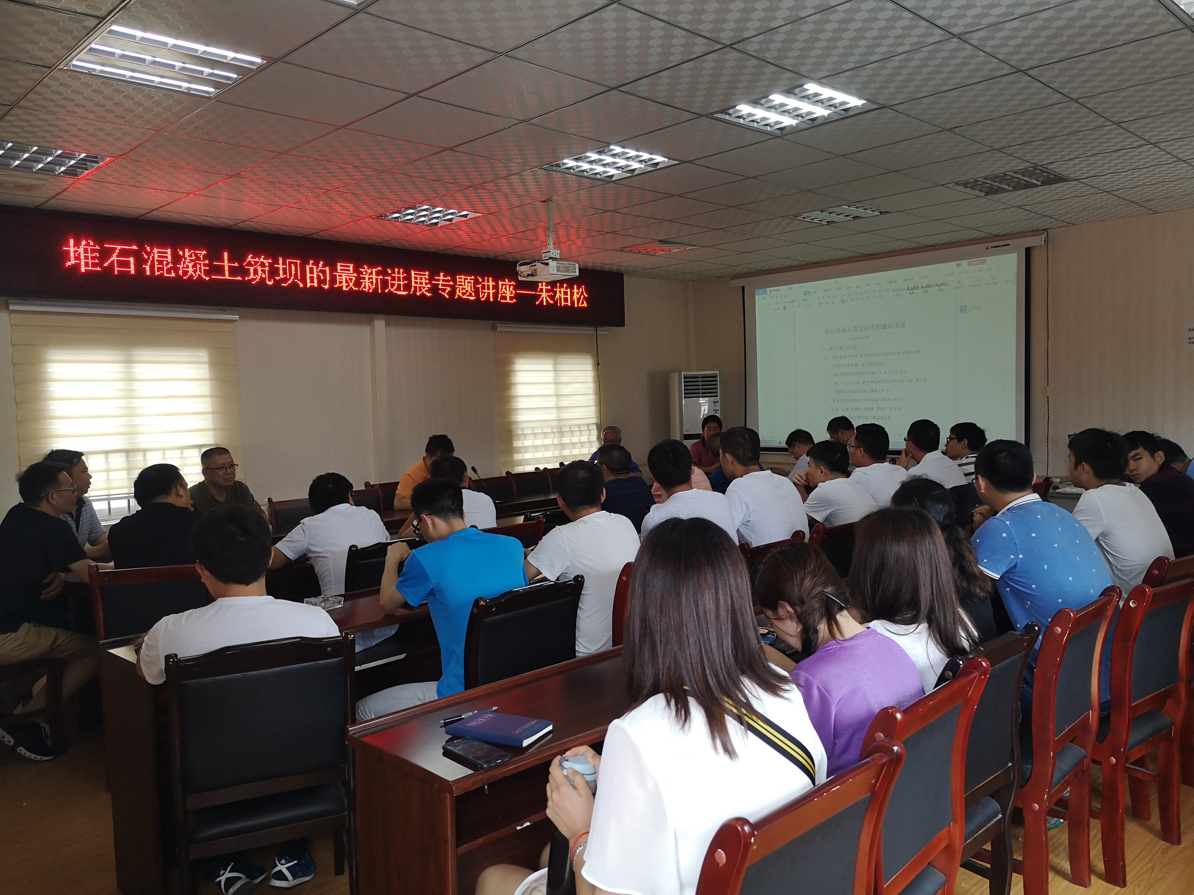 2020年6月16日至6月17日,院总工室在院四楼大会议室举办“堆石混凝土筑坝的最新进展”专题讲座(代内部培训),特别邀请到贵州工业大学退休教授、资深权威专家朱柏松教授主讲(朱柏松:1937年2月生,上海人。1960年毕业于清华大学水利系。曾任贵州工业大学士建系拱坝研究室主任。贵州省水利学会副理事长。长期从事水利工程建筑专业的教学工作)。朱柏松教授就“堆石混凝土筑坝的最新进展”给大家进行了讲解,并与聆听讲座的同志们进行了交流。院在家各部门专业技术人员及州水务局部分同志、相关县份水务局、水务公司的技术人员共计70余人聆听了讲座.通过朱柏松教授生动鲜明的阐述,在场职工听得津津有味,讲完后还表示意犹未尽,受益匪浅,期望我院以后多多组织类似讲学,最后以一阵热烈整齐的掌声结束。